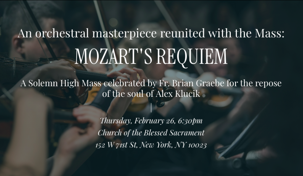 “Alex Klucik, who died in an accident at age 19, was a uniquely virtuous young man devoted to the Eucharist and the Rosary, and his family is launching a Catholic fraternal residence in NYC in his honor. This Requiem Mass will be an opportunity to pray for Alex’s soul and also raise awareness about his life and the legacy being built through this housing project.