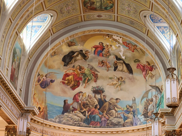 Years ago, I had even looked upon Our Lady of Pompeii as a potential basis of a future Catholic revival. 3) But that apparently is not to be. The stirrings of orthodoxy one could find ten years ago in the bulletin of Our Lady of Pompeii have disappeared – indeed, online I cannot find a bulletin at all. The archdiocese closed the parochial school in 2020. As these images show, even the dominant artwork of the church -the fresco in the apse, dating from as recently as 1985 – has now suffered significant damage.