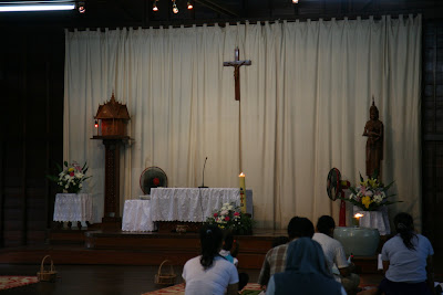 The ceremony itself? The Novus Ordo is hopeless in any language, but the form it takes here tends to exacerbate its weaknesses. Aside from the music and a couple of processions, the Mass was basically a dry series of texts read to the congregation with the priest kneeling or seated behind a low altar. It is a very minimalistic modern liturgy – strange in a country whose Buddhist and royal traditions are so rich in ritual, dance, colors and incense. Moreover, I was handed some English language materials, emanating from writers of the “American Catholic Church,” which were at times positively horrifying in their unbelief.