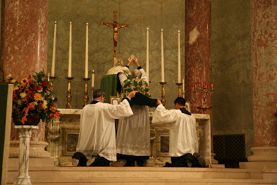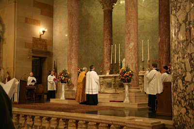 On Sunday, November 18, a Missa Cantata was celebrated in the magnificent surroundings of the Church of the Immaculate Conception, Waterbury. The vast Roman-style edifice was filled with worshippers, and our Society had the honor of providing support for what we understand to be the first Traditional liturgy to be offered in Waterbury in forty years. Our chaplain, Father Cipolla, celebrated the Mass and the Society provided the Master of Ceremonies and a server as well. Seminarians from Holy Apostles Seminary, Cromwell, CT, provided the splendid chant for the Mass. It was a glorious evening and congratulations are in order for Father John Bevins, Pastor, and the reverent and enthusiastic parishioners! Father Bevins announced that the Traditional Mass would now be celebrated next Sunday at 6 P.M.