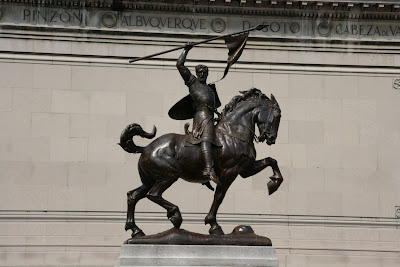 In the courtyard of the sadly neglected group of museums at West 155th street and Broadway we find this striking statue of El Cid, who reenergized the liberation of Spain from the Moors in the 11th century. It stands between the two exhibition halls of the Hispanic Society, one of the great hidden treasures of New York.