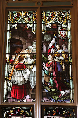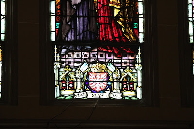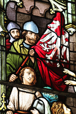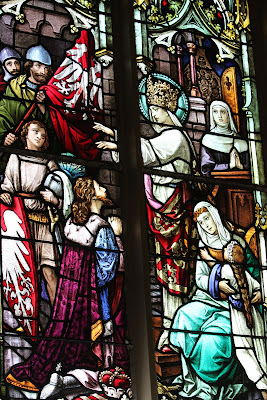 I believe – subject to correction by experts- that this window shows St. Hedwig blessing her son Henry before going off to fight the Mongols in Silesia in 1241(he was annihilated). She was actually German (as were half the forces under her son’s command).