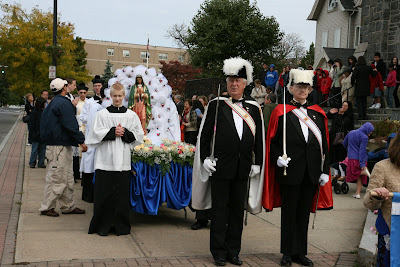 On this pleasant, chilly Columbus Day, parishioners of St. Mary Norwalk processed down West Avenue to the staute of Christopher Columbus in Thomas C. O’Connor park, praying the rosary, in thanksgiving for Columbus’s bringing the Catholic faith to the New World.