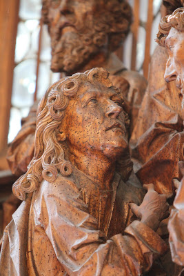 We conclude our survey of the reredos (Gothic, Renaissance and Baroque) by turning to perhaps the most popular master of the large altarpiece in Germany: Tilman Riemenschneider (1460-1531). He lived and worked in and around the city of Wuerzburg in the region of Franconia and brought the art of the German reredos to rare perfection. But his achievements were on the verge of the Reformation that extinguished in most of that country the theological basis for such masterpieces: belief in the Mass, the Eucharist, the intercession of the saints, the superiority of the contemplative life and the value of good works such as furnishing the house of God with splendid art.