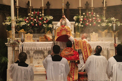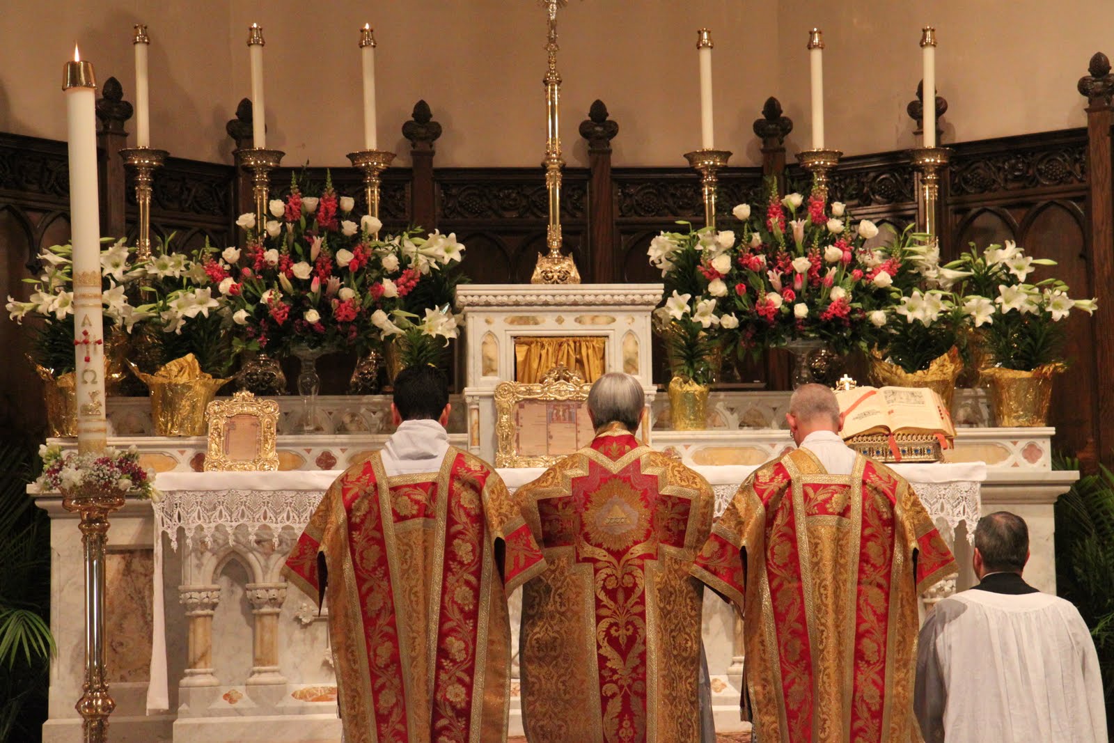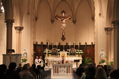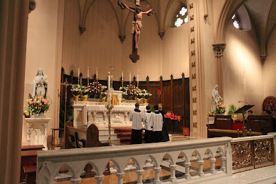 Our coverage of 2010 Holy Week at St Mary’s Norwalk ends with Solemn Mass on Easter Sunday morning, celebrated in this parish’s newly restored sanctuary. It was a triumphal week regarding both the beauty of the services (the music, the vestments, the choreography) and the immense response from the parish. Great thanks are owed above all to the pastor, Fr. Greg Markey. We look forward to the further development of the Traditional rite at St. Mary’s and the continued restoration of the church.