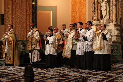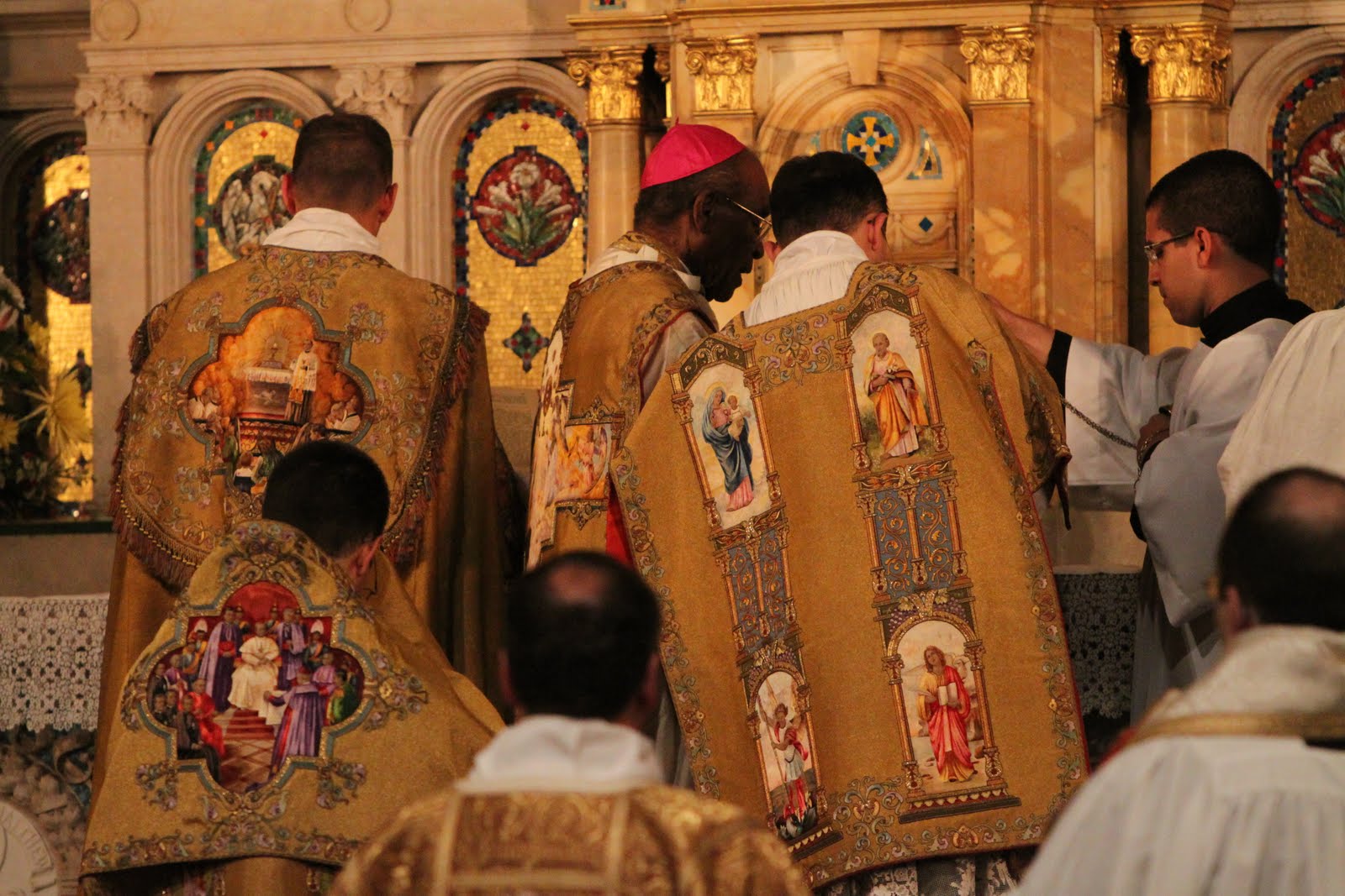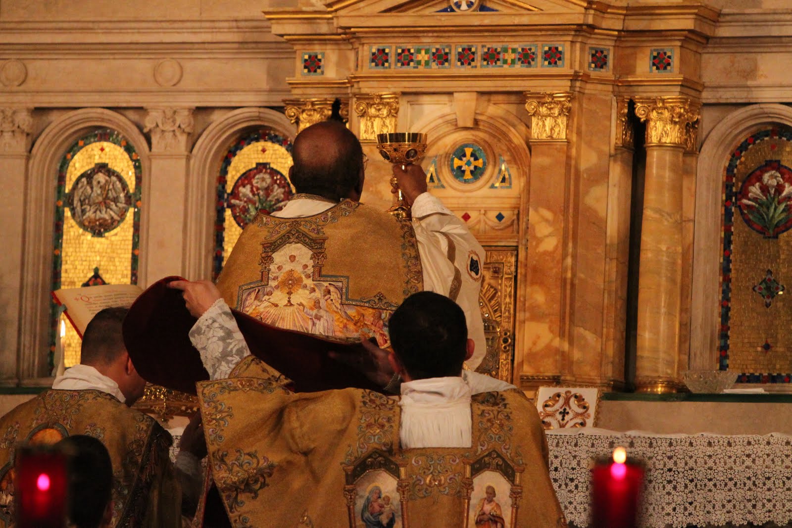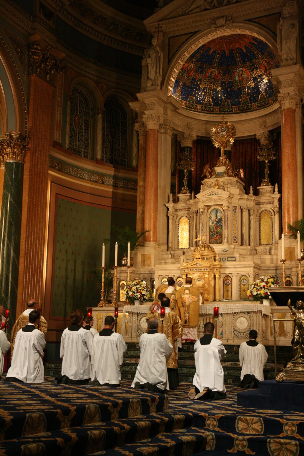 Archbishop Francois Gayot, Archbishop emeritus of Cap-Haitien, Haiti, celebrated a magnificent solemn Pontifical Mass for the feast of the Sacred Heart yesterday, June 11th, at St Jean Baptiste Church in Manhattan. The Confraternity of the Sacred Heart, which sponsored the mass as well as a conference today, did its usual very professional job regarding ceremony, vestments and music. The musicians, under the the direction of Kyler Brown, seemed particularly happy in the organ music and in the more recent pieces such as Lauridsen’s Ubi Caritas. The congregation was not quite as large as last year; the announcement of the mass came out rather late.