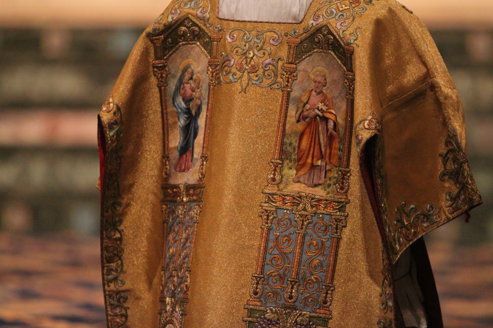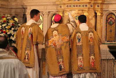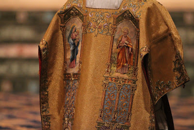 The set of vestments for the solemn liturgy are of unusual magnificence. Subject to correction, they appear to date from the year of the beatification of St Peter Julian Eymard (1925). He was the founder of the Blessed Sacrament Fathers who administer this church.