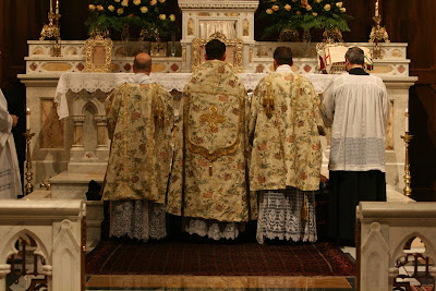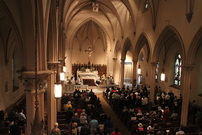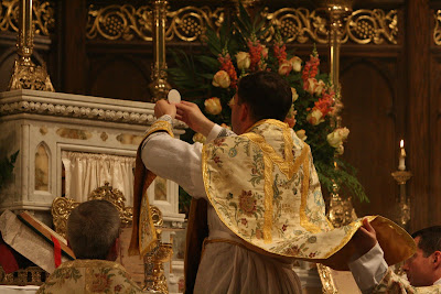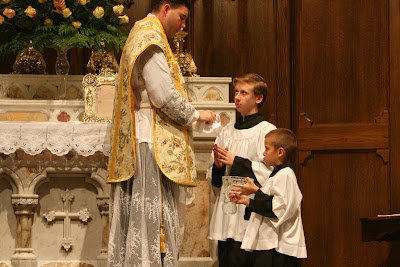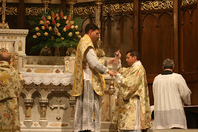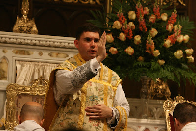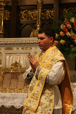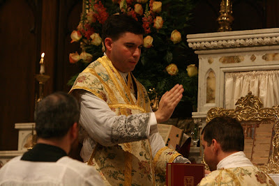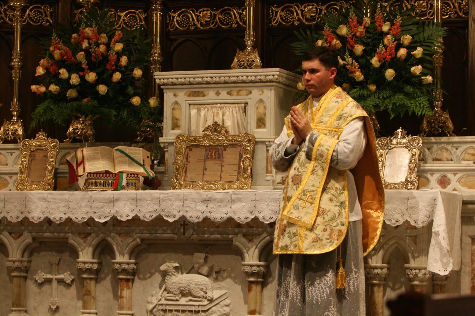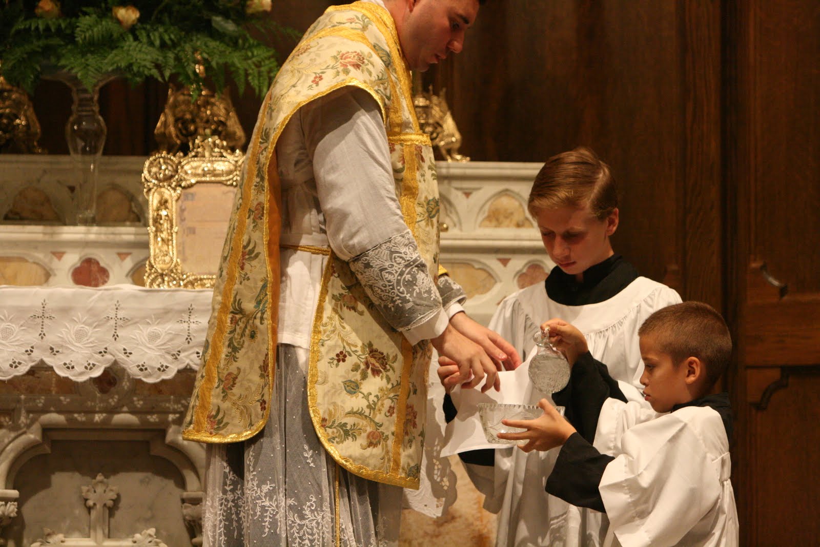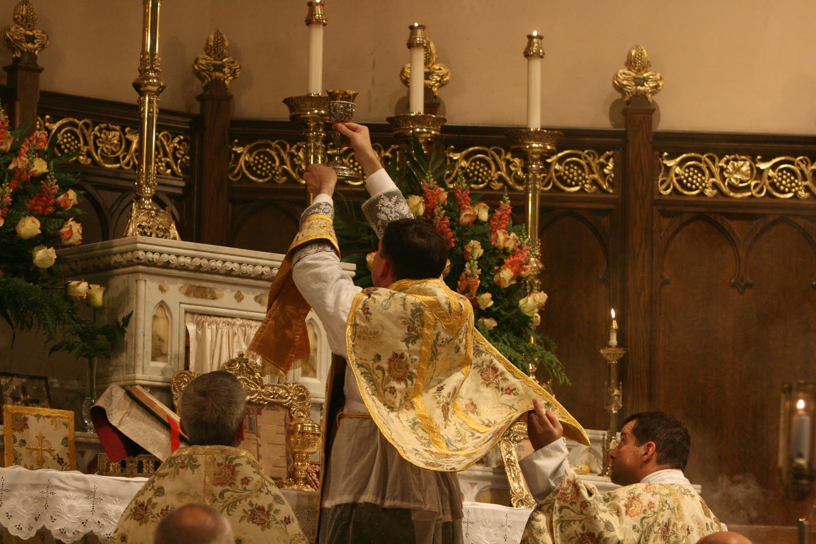 On Sunday August 22, Rev. Aaron Huberfeld, Canon of the Institute of Christ the King, Sovereign Priest, offered his first Solemn High Mass in the United States. Fathers Cyprian LaPastina and Greg Markey served as deacon and subdeacon. Fr. Matthew Talarico of the Institute of Christ the King served as assisting priest and preached. A large congregation assisted at the Mass at St. Mary Norwalk. The music, conducted by Mr. David Hughes included, among other pieces, the “Missa de Beata Maria” of Tomas Luis de Victoria. At the reception after the service, Fr. Huberfeld gave his priestly blessing to a seemingly endless line of the faithful.