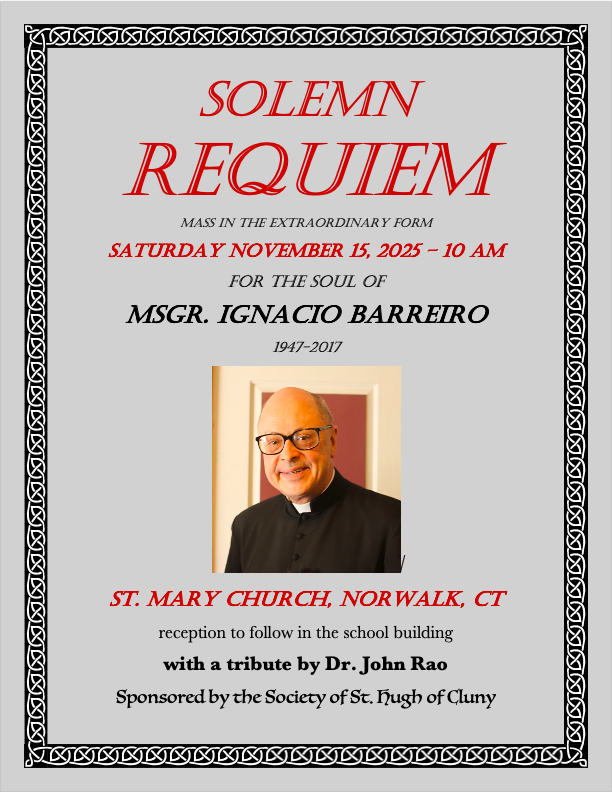 I hope as many of you who can will attend this Requiem Mass for Msgr. Barreiro. For many years he was a leader in the pro-life apostolate and in the cause of the Traditional Mass. A reception will follow the service at which Prof. John Rao will speak about the life of Msgr. Barreiro and the events of Catholic Traditionalist history in which he participated. Prof. Rao is eminently qualified for this task – he knew Msgr. Barreiro well and is currently working on a history of the development of Catholic Traditionalism.