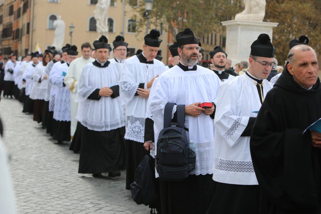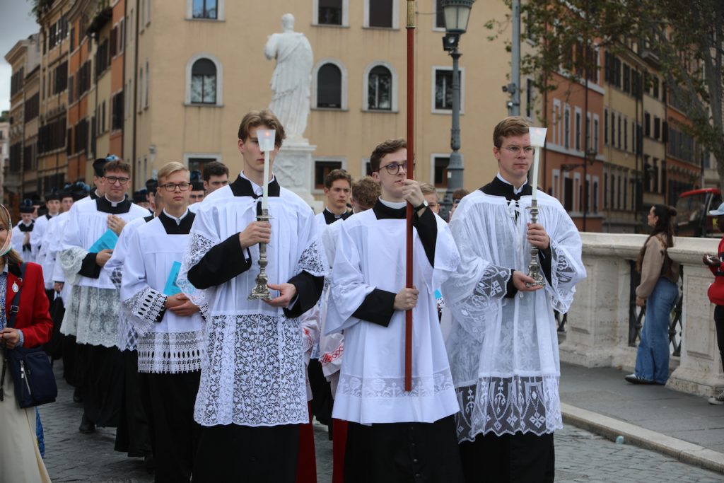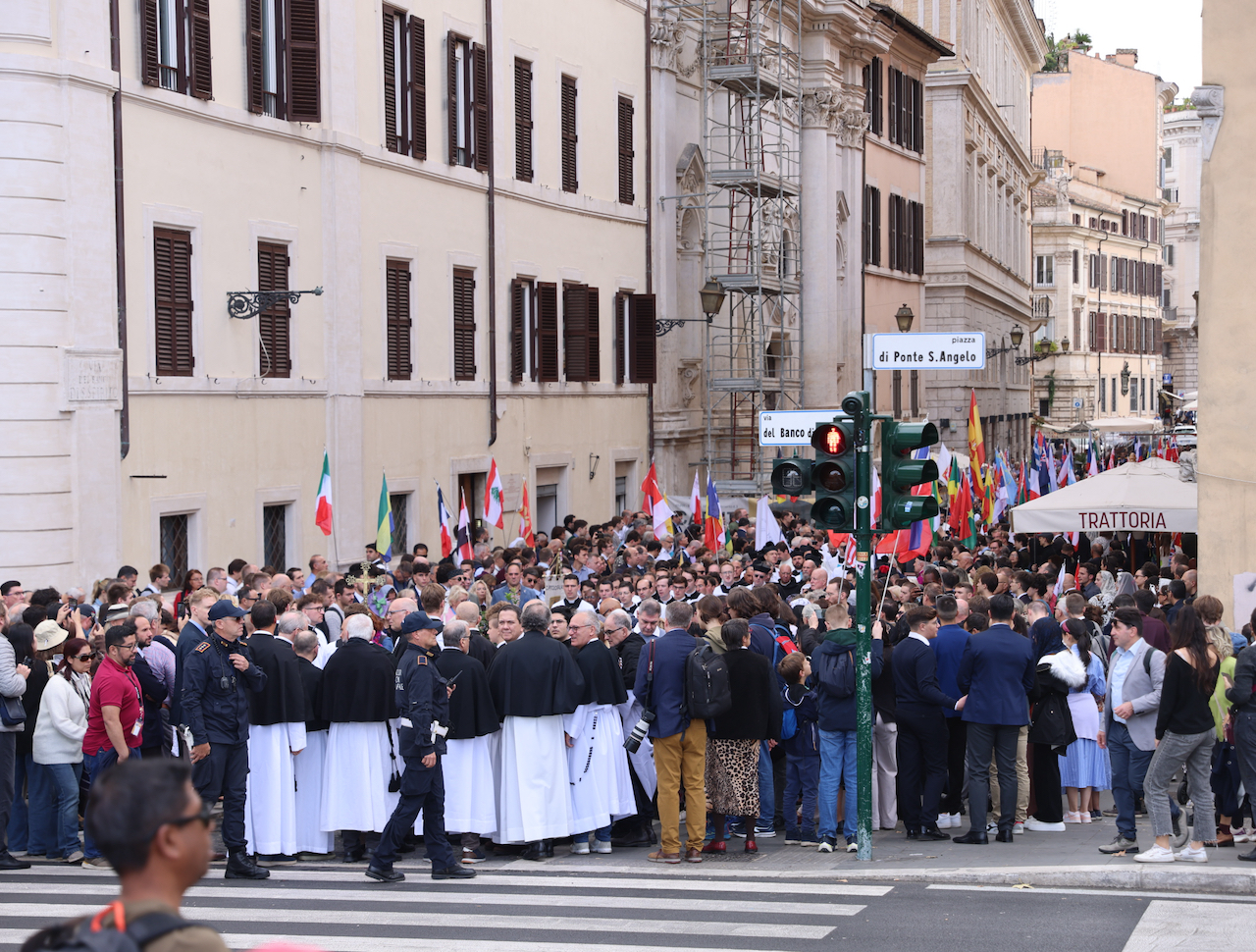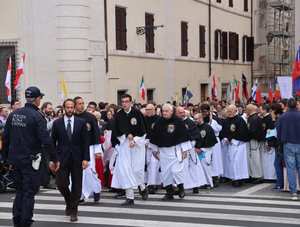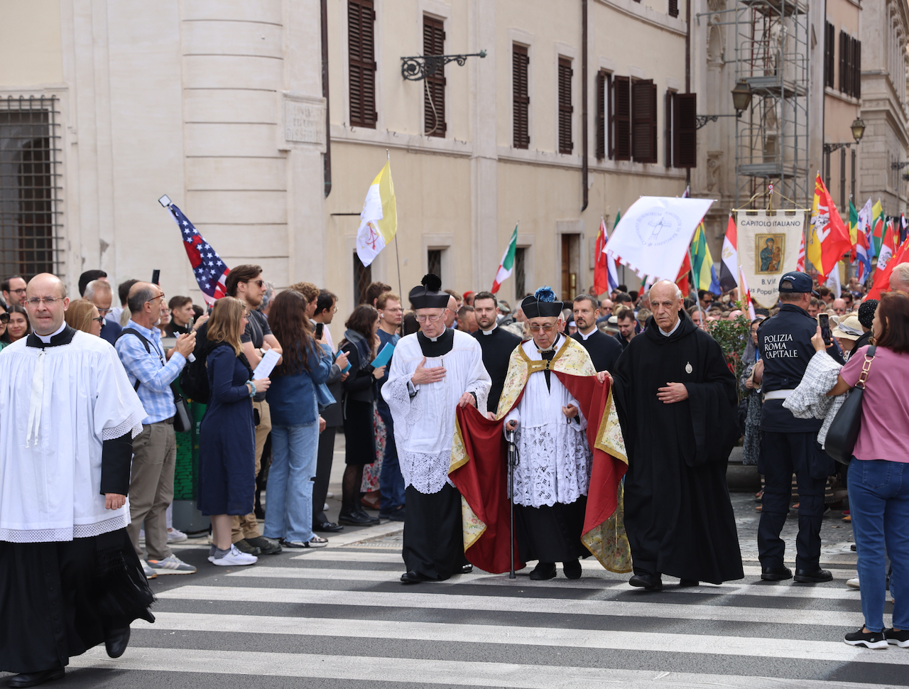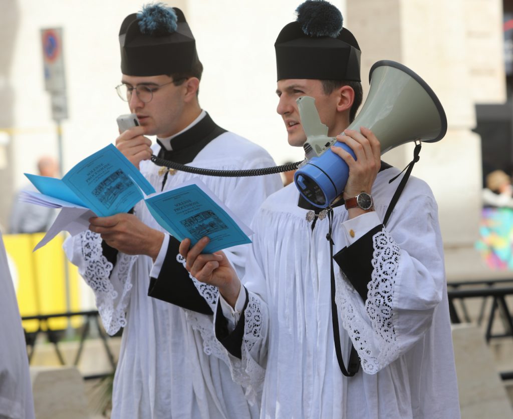(Above). Saturday Morning. Assembly of the pilgrims and recitation of the Rosary in the street before the church of Santi Celso e Giuliano. Now closed for restoration, it is under the administration of the Institute of Christ the King, Sovereign Priest. But this modestly dimensioned church would in any case have been totally inadequate for this number of pilgrims!
