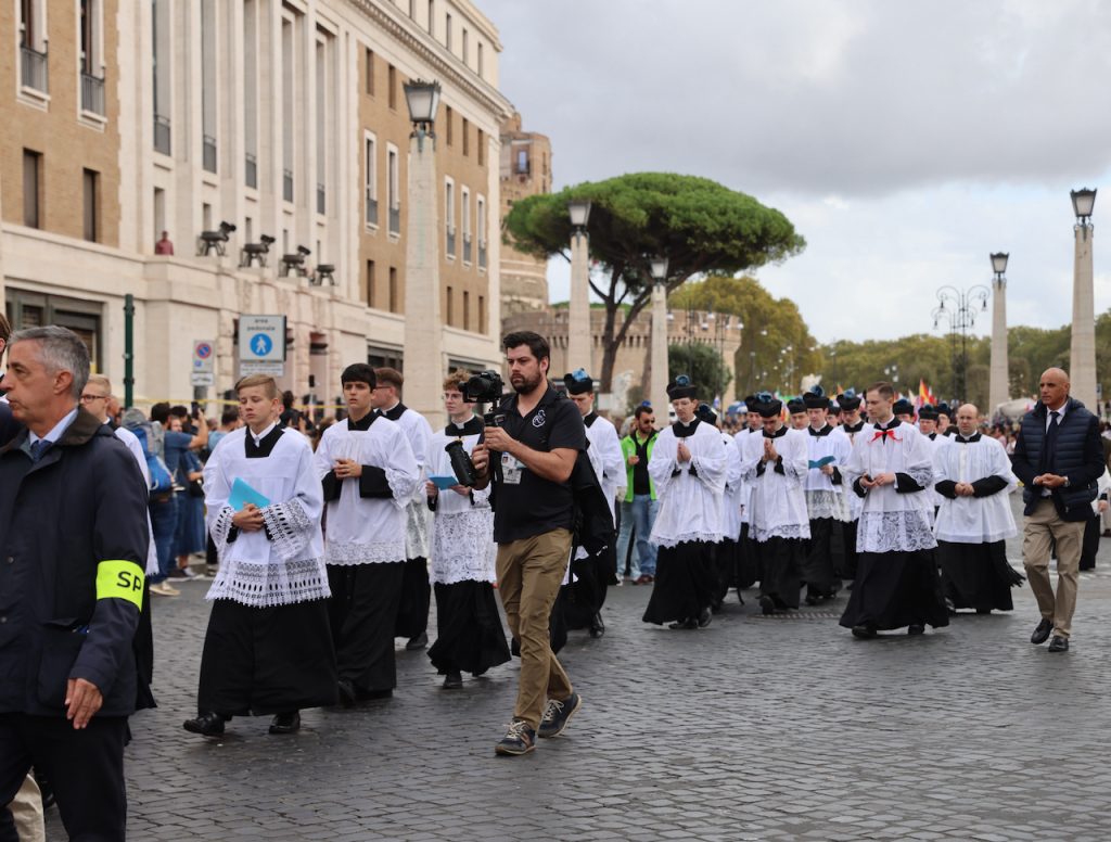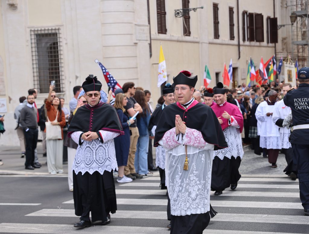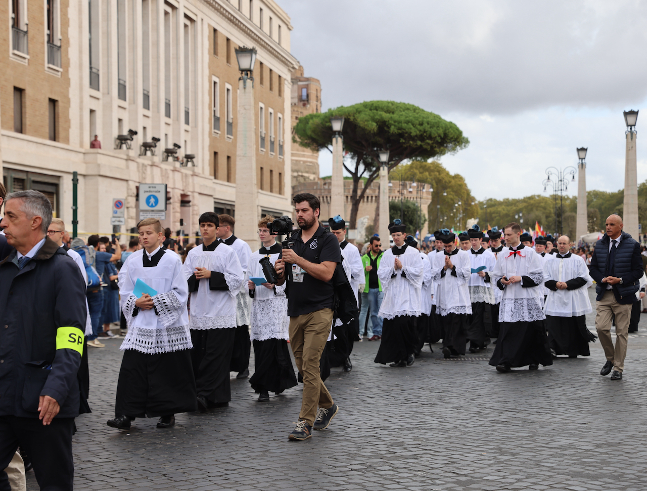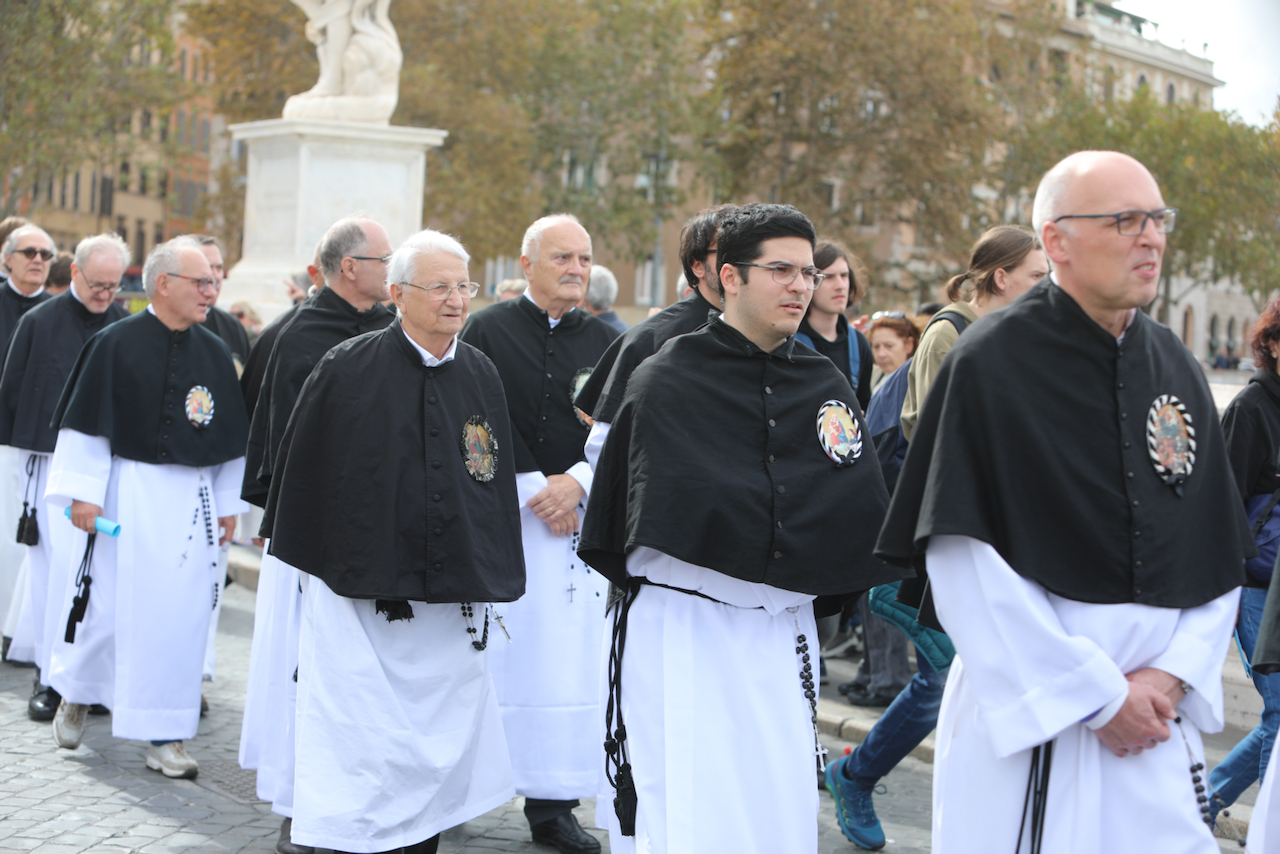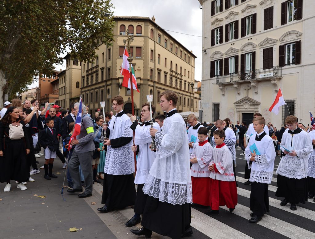 (Above). Saturday Morning. Assembly of the pilgrims and recitation of the Rosary in the street before the church of Santi Celso e Giuliano. Now closed for restoration, it is under the administration of the Institute of Christ the King, Sovereign Priest. But this modestly dimensioned church would in any case have been totally inadequate for this number of pilgrims!