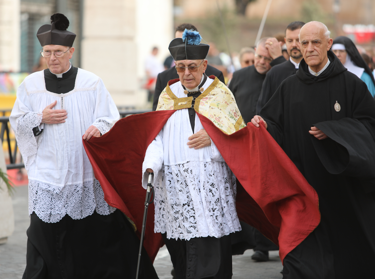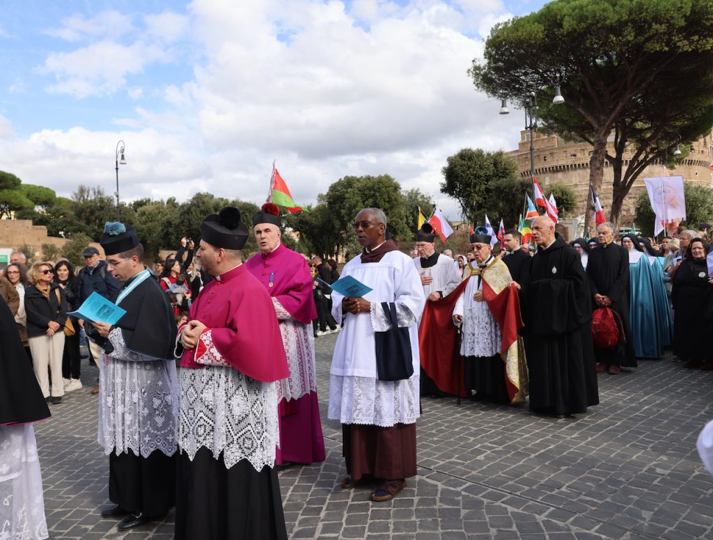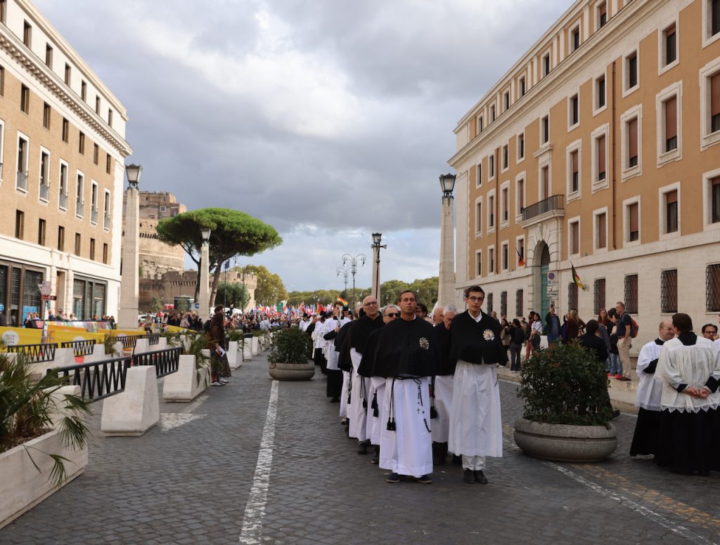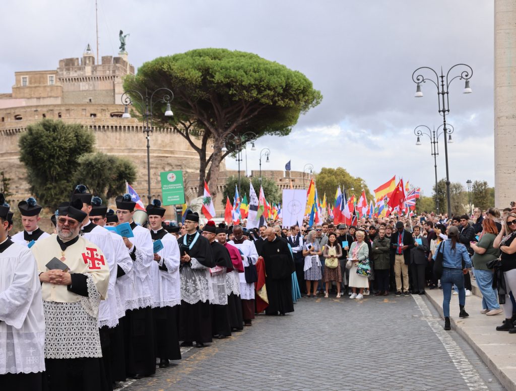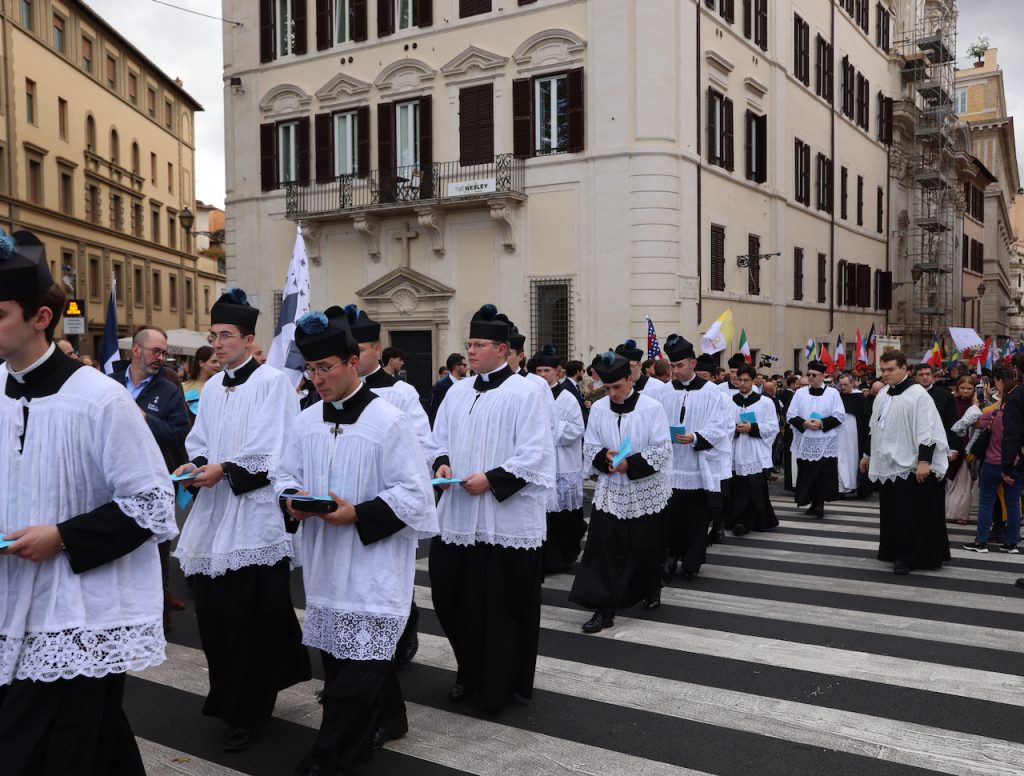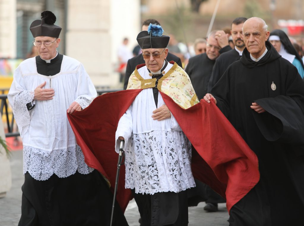 (Above). Saturday Morning. Assembly of the pilgrims and recitation of the Rosary in the street before the church of Santi Celso e Giuliano. Now closed for restoration, it is under the administration of the Institute of Christ the King, Sovereign Priest. But this modestly dimensioned church would in any case have been totally inadequate for this number of pilgrims!