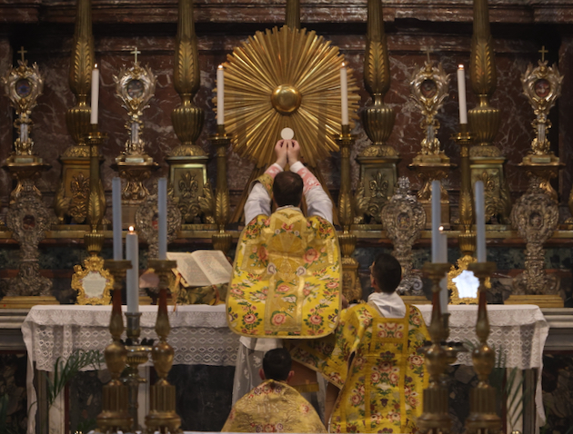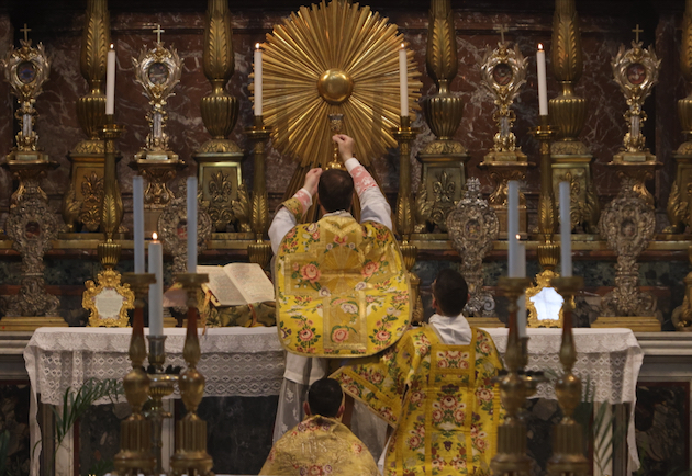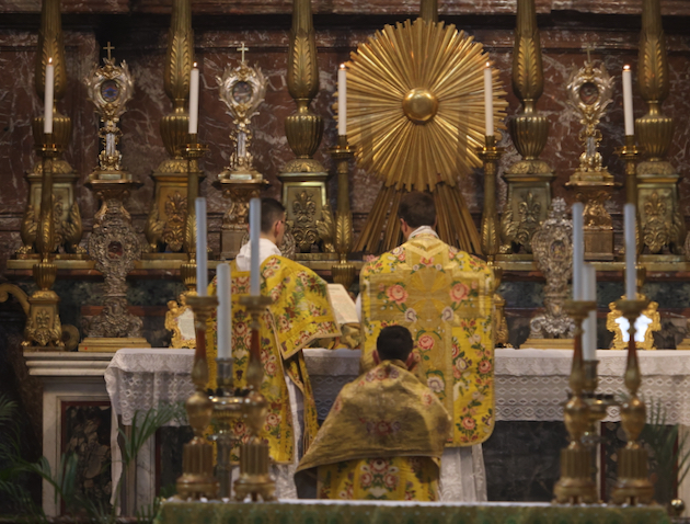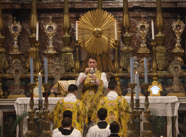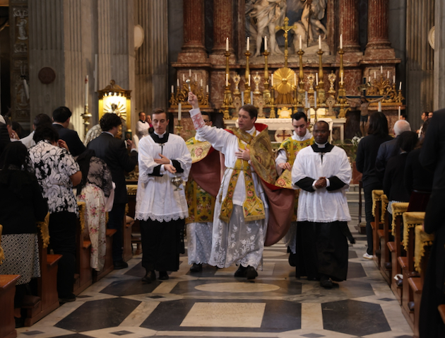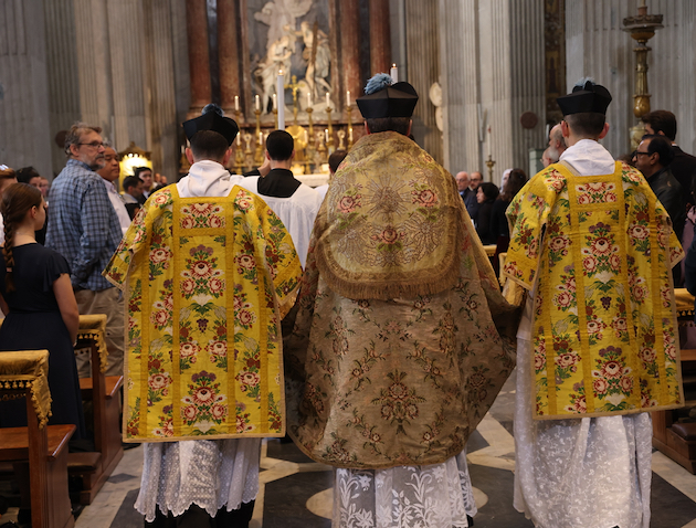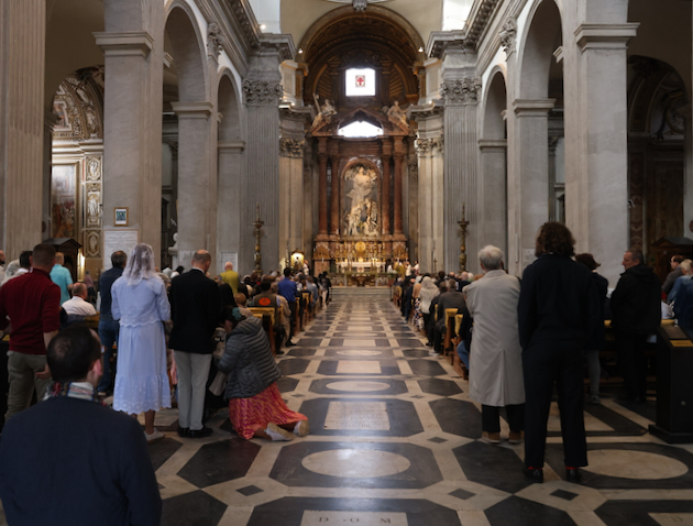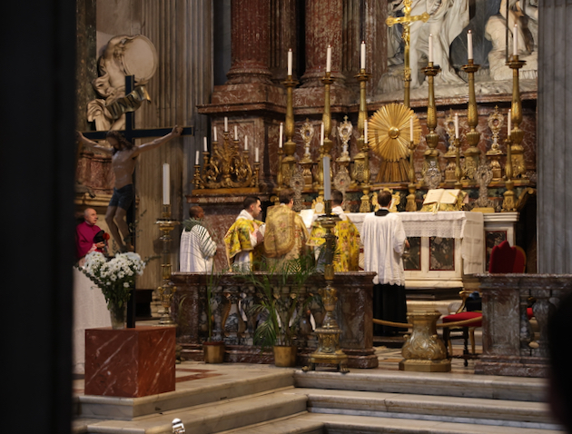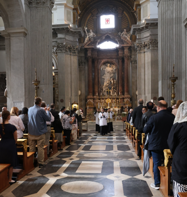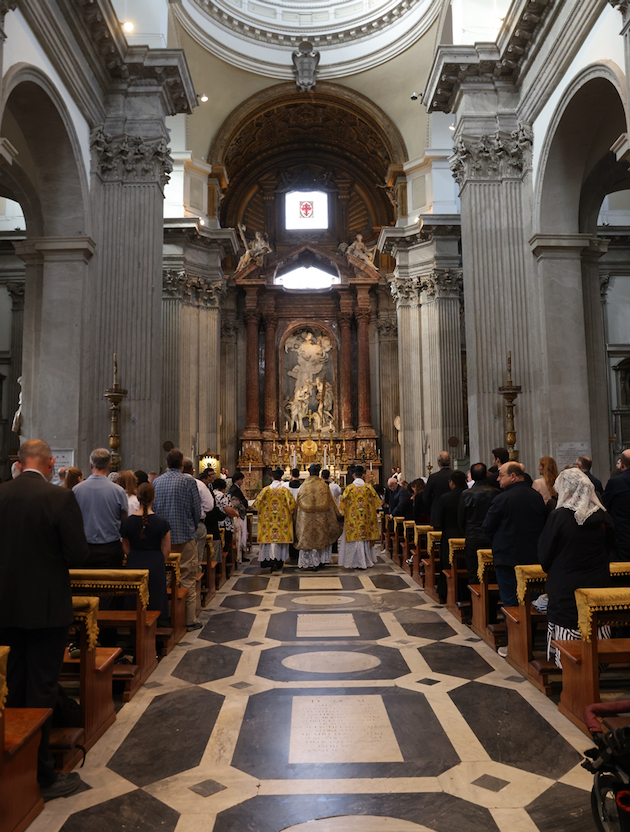 The 14th Pilgrimage Summorum Pontificum concluded with several Masses on Sunday. Besed on our experiences last year (even though we had seats!), we didn’t dare attend the Mass formally concluding the pilgrimage at Santissima Trinita. Fortunately, there was an earlier Mass celebrated by priests of the institute of Christ the King, Sovereign Priest, at the church of San Giovanni dei Fiorentini. It was still standing room only.