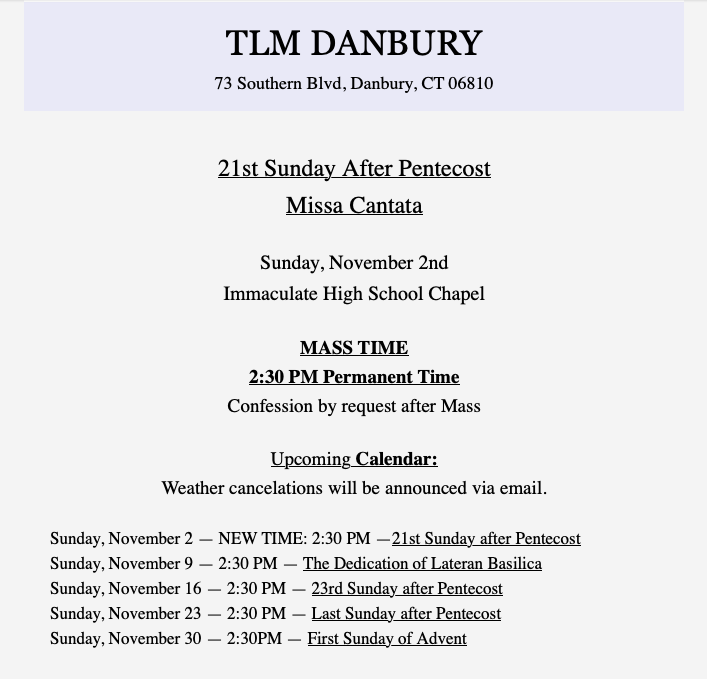 Permanent Time Change for Sunday Traditional Mass in Danbury