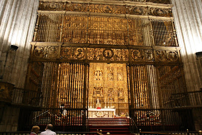 The great altarpiece, or Retablo Mayor, of Seville Cathedral. It was carved of wood between 1482 and 1526. In its golden splendor it sets the sanctuary apart as a sacred, heavenly space – much like the Russian iconostasis ( which, however, stands in front of the sanctuary).