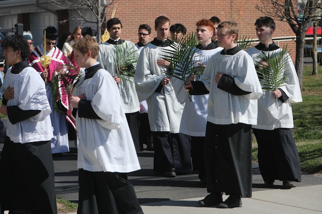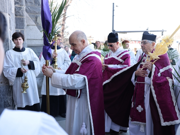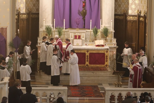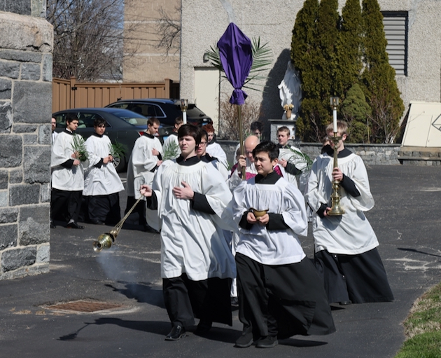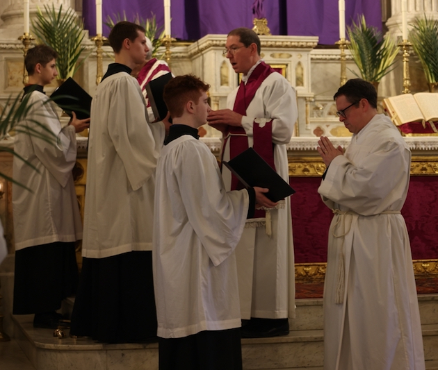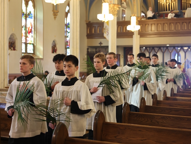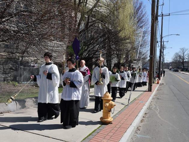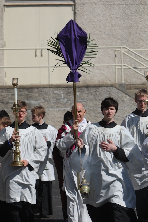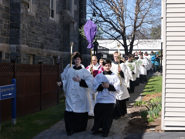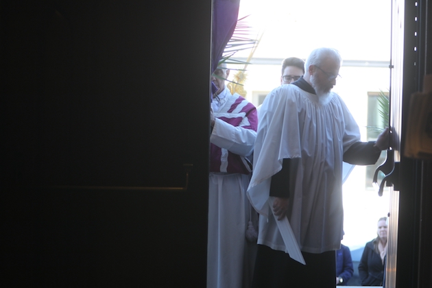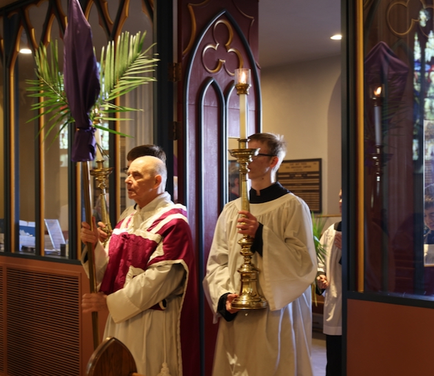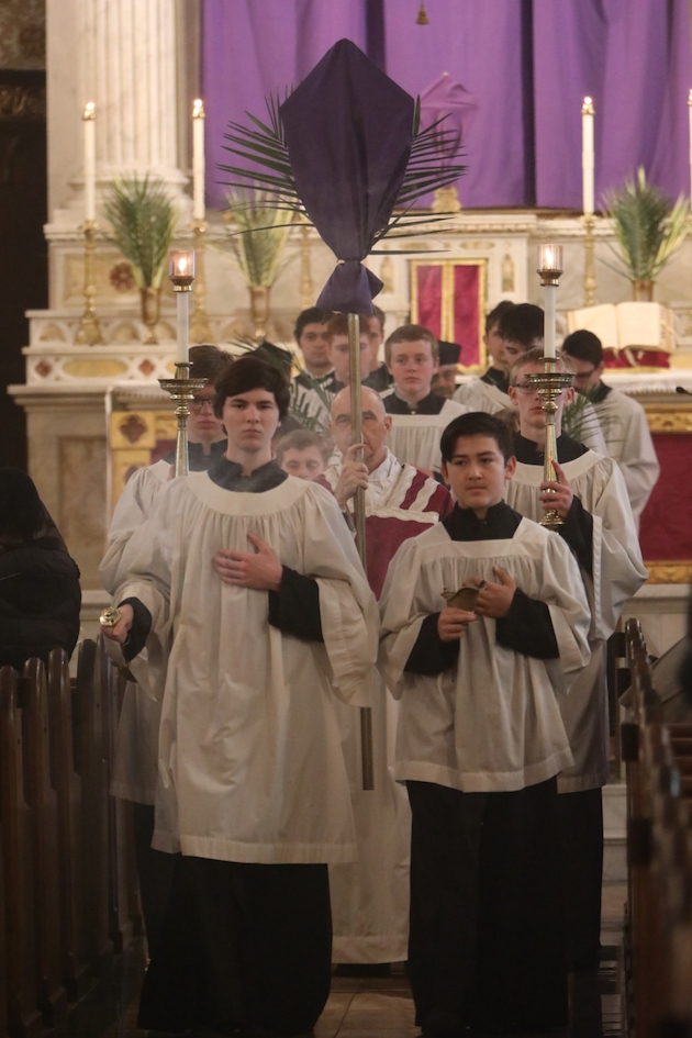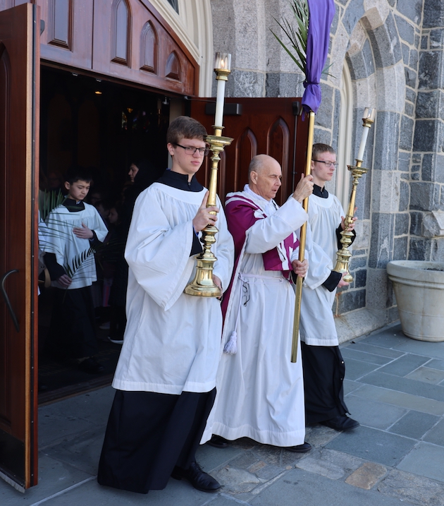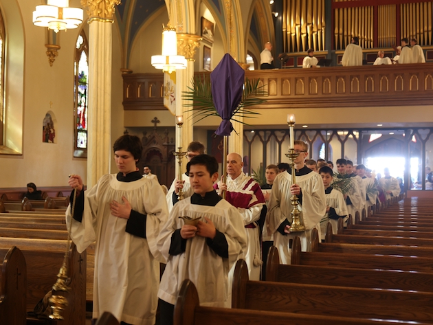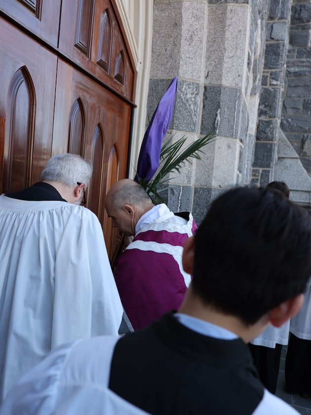 The subdeacon chants the Epistle. (He removes his folded chasuble to perform his office)Blessing the palmsThe processionAbove and below: When the sacred ministers reach the door, cantors within sing the hymn “Gloria, laus et honor” and the faithful respond with the refrain.The subdeacon bangs three times on the doors with the foot of the cross. The doors are flung open and all enter.The Passion of St. Matthew is chanted by three cantors. (Below) The choir provides the polyphonic responses of the crowd.
