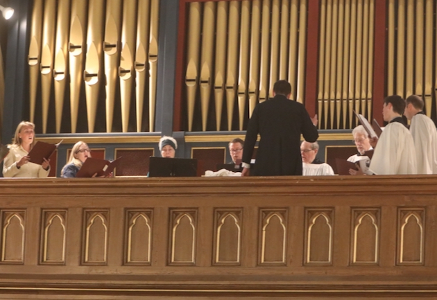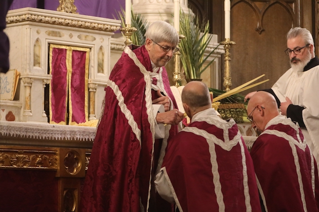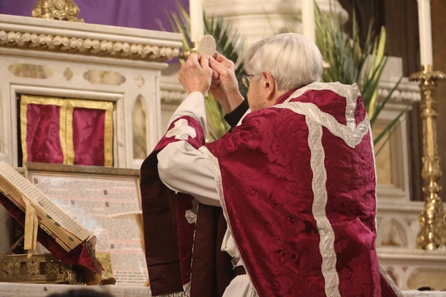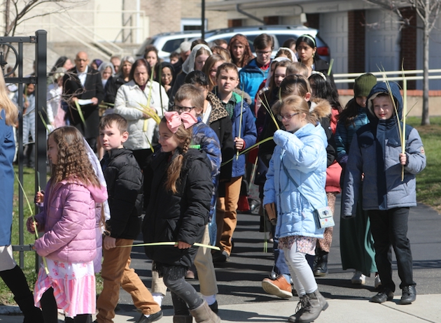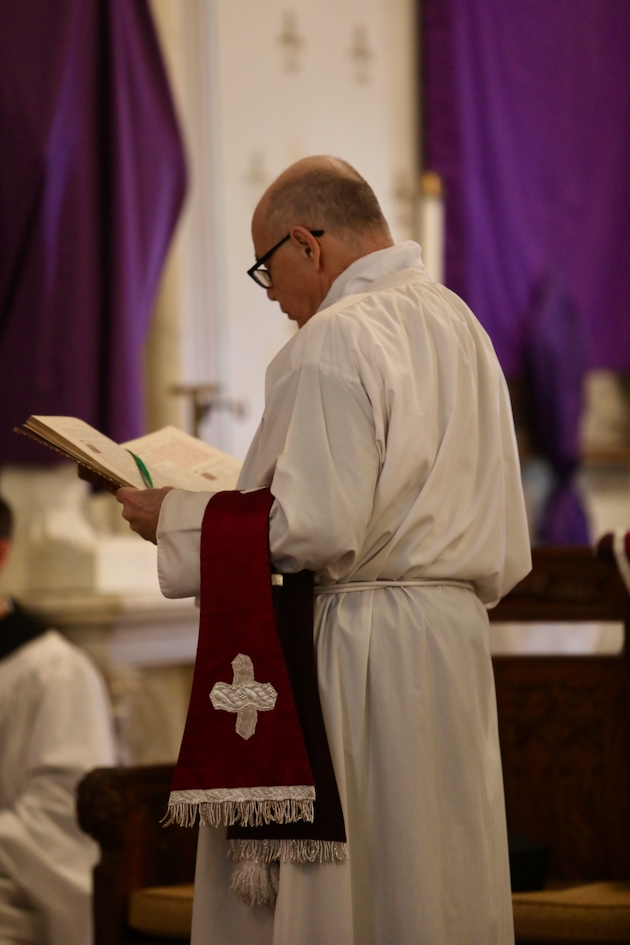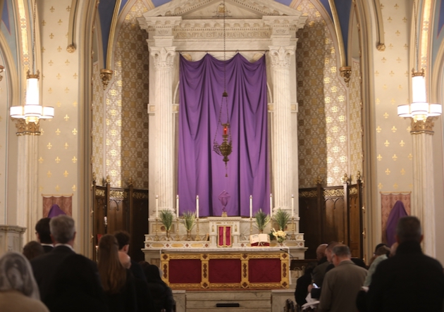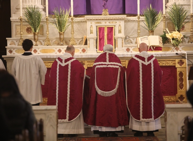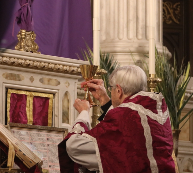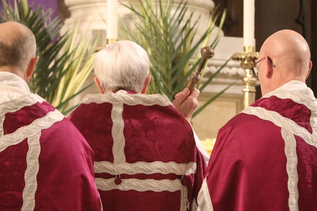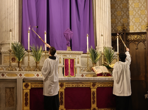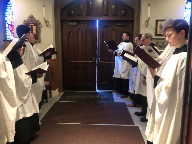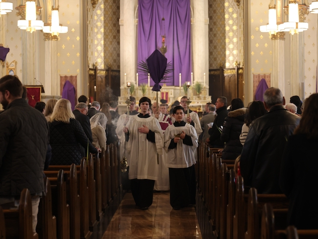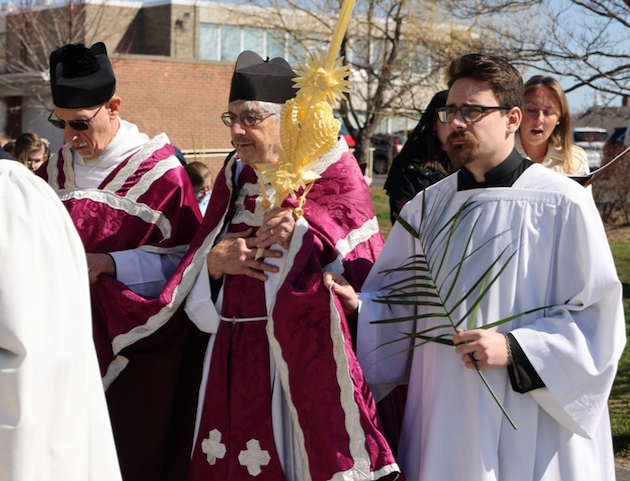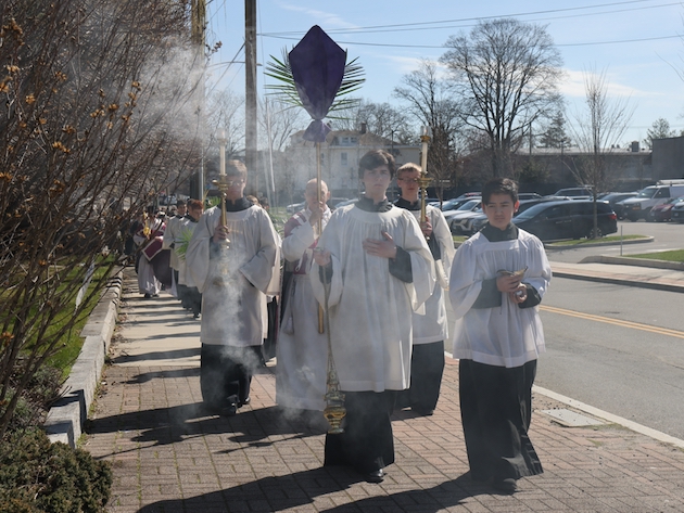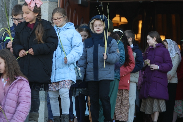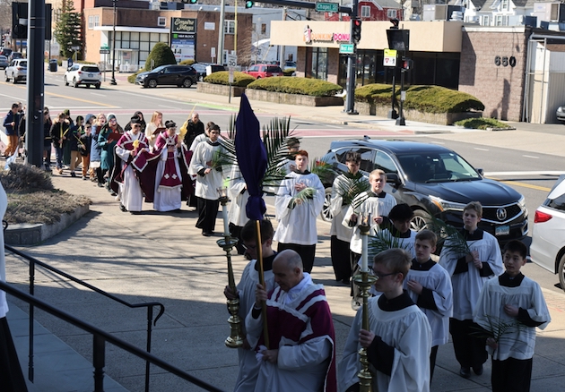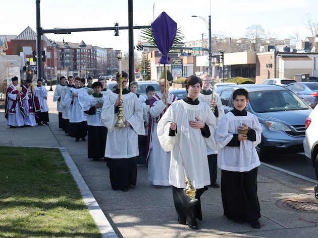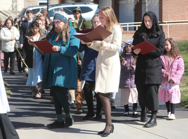 The subdeacon chants the Epistle. (He removes his folded chasuble to perform his office)Blessing the palmsThe processionAbove and below: When the sacred ministers reach the door, cantors within sing the hymn “Gloria, laus et honor” and the faithful respond with the refrain.The subdeacon bangs three times on the doors with the foot of the cross. The doors are flung open and all enter.The Passion of St. Matthew is chanted by three cantors. (Below) The choir provides the polyphonic responses of the crowd.