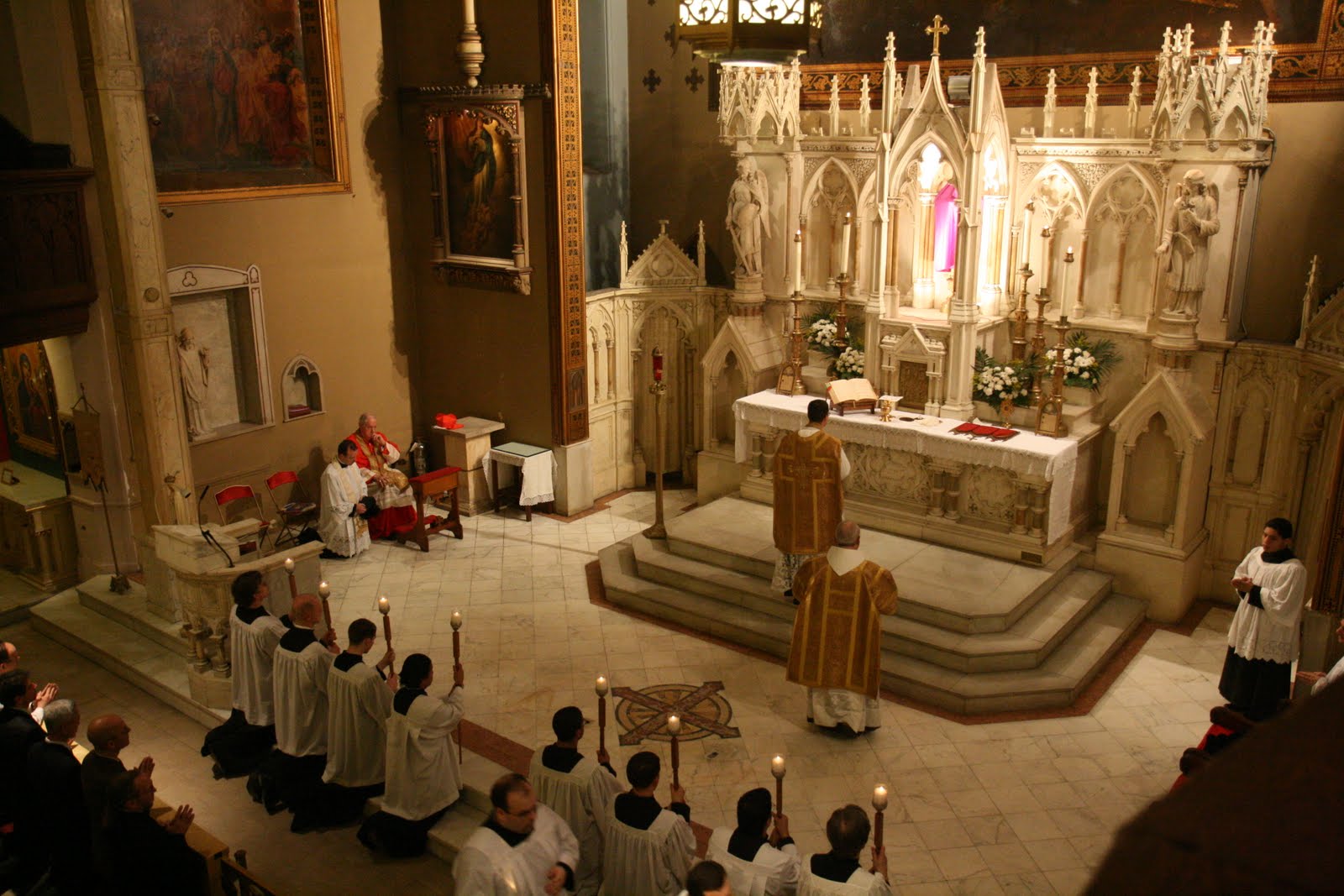 Preparations were underway today for tomorrow’s Solemn Mass for Palm Sunday in the newly restored sanctuary of St. Mary’s Church, Norwalk. The upper church has been closed for several months as a beautiful marble altar rail has been installed, as well as a marble pulpit and a marble mosaic floor. Masses will be celebrated for the first time tomorrow in the newly refurbished sanctuary. The 9:30 Extraordinary Form Mass will be preceded by an outdoor procession.