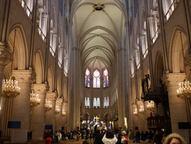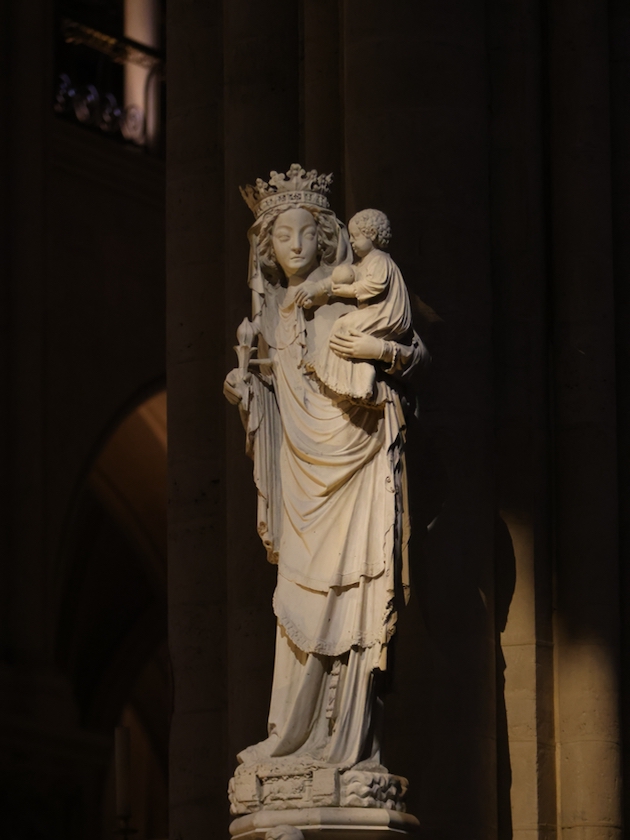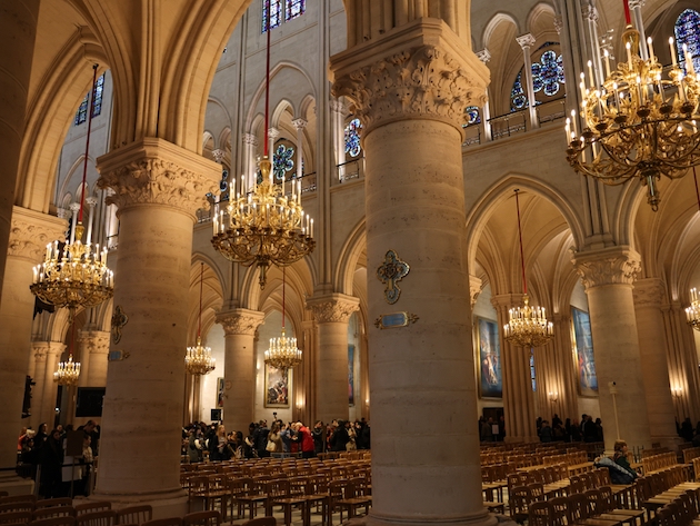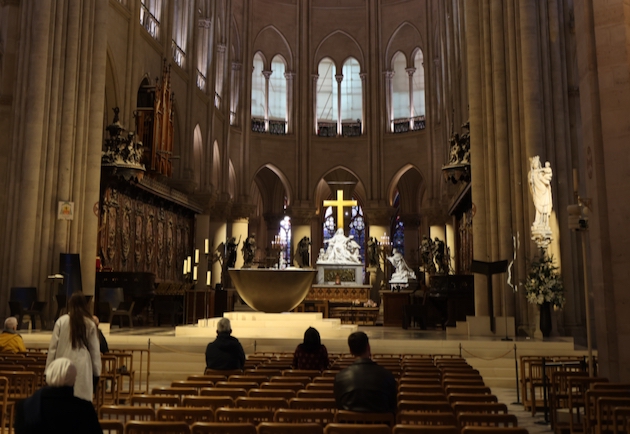 Inside, the restoration after the 2019 fire has given the interior a bright, almost whitewashed look. I suppose this is intended to recreate the appearance of the cathedral in the 12th and 13th centuries – at the time of its construction. The problem is that many centuries have elapsed since then! And the effects are magnified by the bright lighting installed now. (We have earlier discussed similar restoration initiatives – or deformations – in New York at St. Patrick’s cathedral.