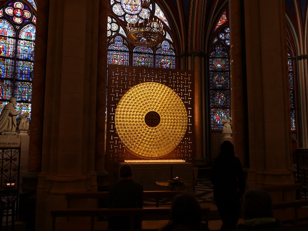 In the ambulatory. (Above) The “space-age” reliquary of the Crown of Thorns, brought to Paris by St. Louis. (We could not see the relic.) (Below) A favorite habit of the “Conciliar Church”: a museum-like display of Eastern icons. Those praying in these chapels, however, were few and far between.