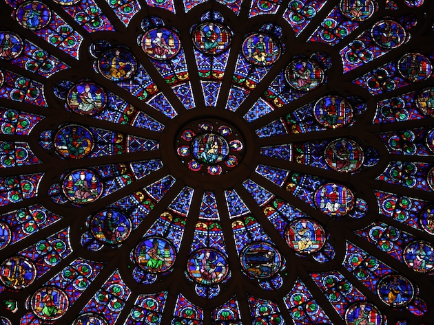 Some things are unchanged or have been expertly restored. (Above) A mid-14th century Madonna. A sign reads “placed in front of this pillar in 1855 and since prayed as ‘Notre Dame de Paris’ “(sic). (Below) one of the great rose windows dating to the reign of St. Louis.