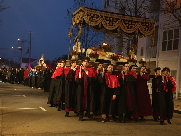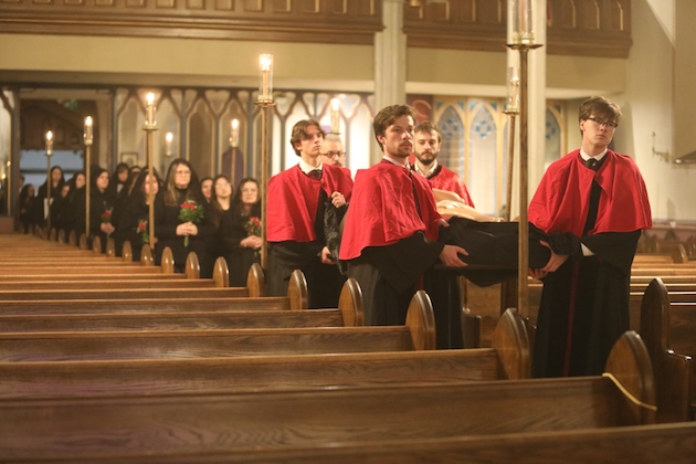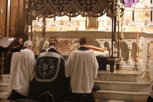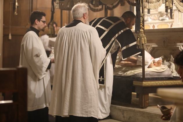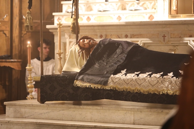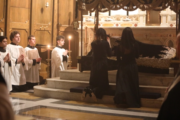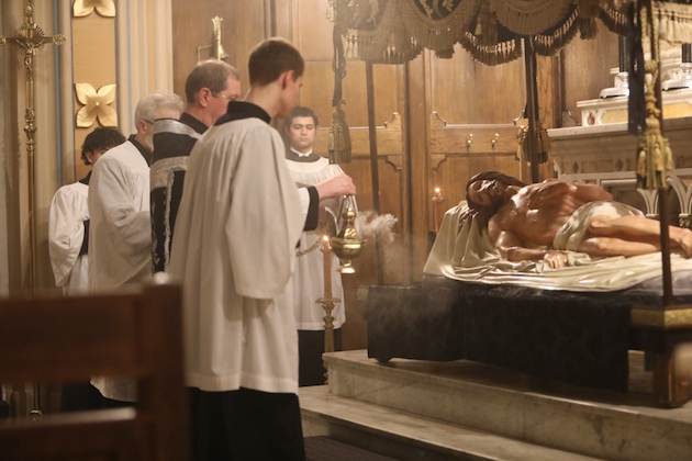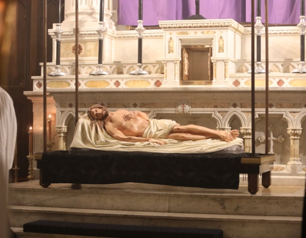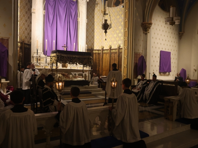 The bier of the Body of Christ is returned to the Church as the hymn “Vexilla Regis” is sung. It is placed before the high altar, whre is is ritually washed and buried by the clergy, as the choir sings the psalms and the Lamentations of Jeremiah from the first nocturn of the Office of Matins of Holy Saturday (From the program of the service).